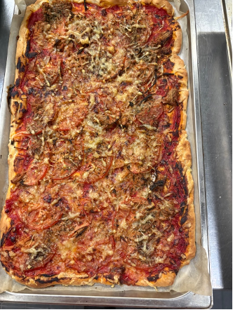 Iltapalan pitsan (kuvassa) kanssa oli tarjolla myös pannukakkua.