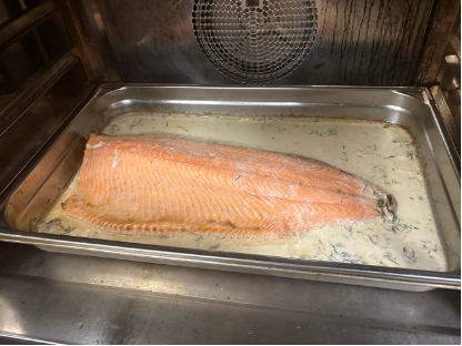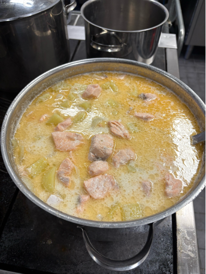 Lounaalla oli vuorossa lohikeitto. Sen myötä kaikki 20 kiloa lohta tuli käytettyä. Lohi on ollut koko leirin ajan hyvin pidettyä.